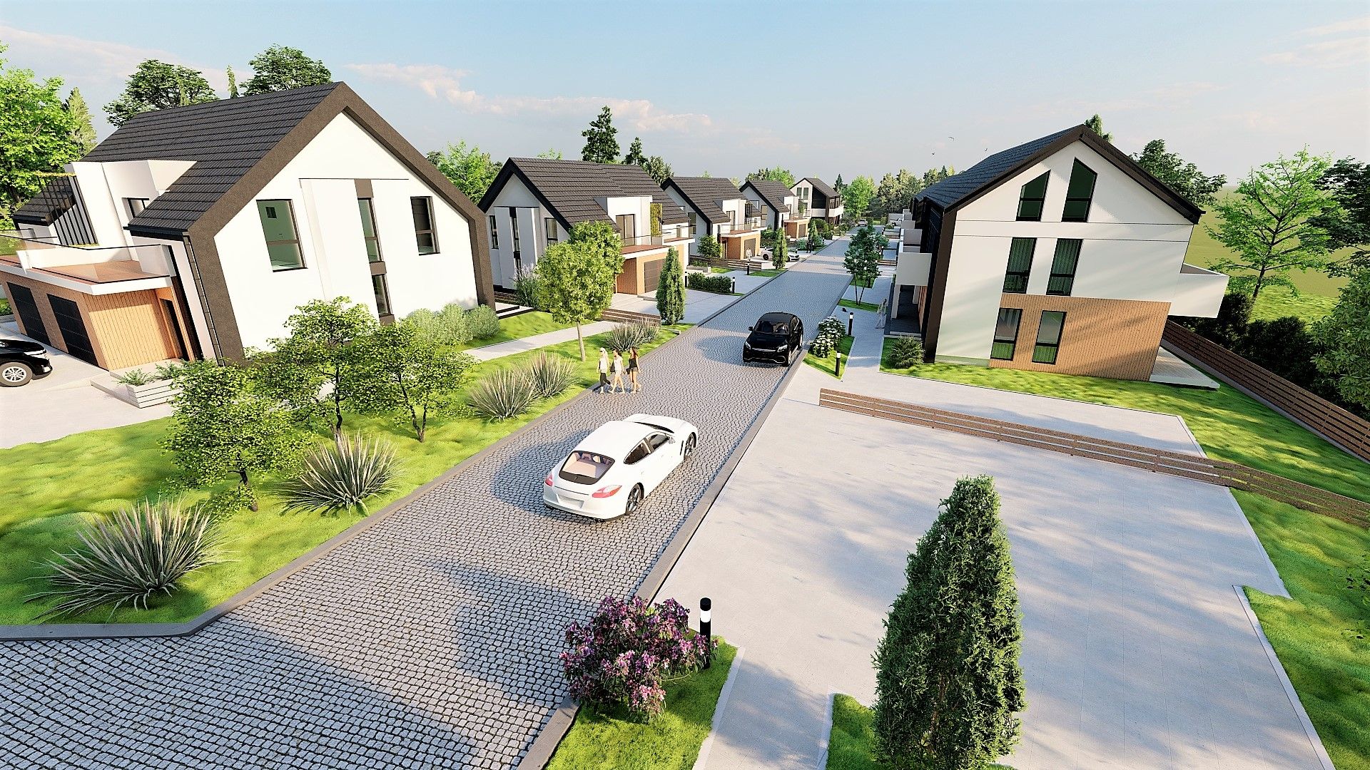 garażem oraz przestronnym tarasem. Każdy z nich otoczony rozległym ogrodem, co pozwoli przyszłym mieszkańcom na jak najszersze możliwości aranżacyjne ich prywatnej zieleni.